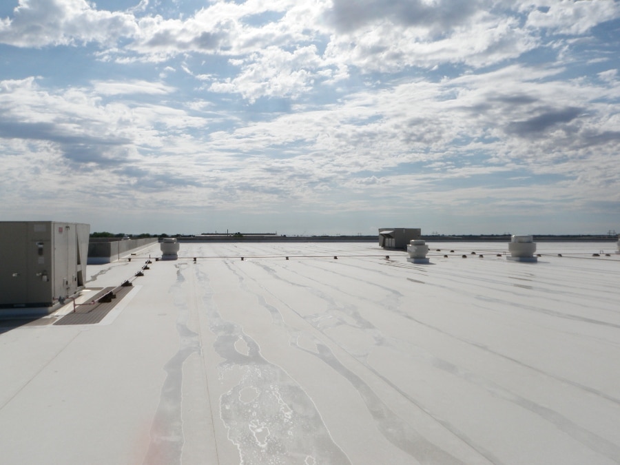 We had been performing repairs and maintenance on this 230,000 square foot roof for several years when disaster struck. A major hail storm severely damaged the roof—exposing the sensitive chemicals inside to moisture, a potentially explosive situation.